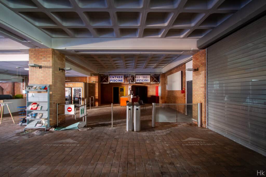 L’entrée de la piscine et les restes de la salle de basket