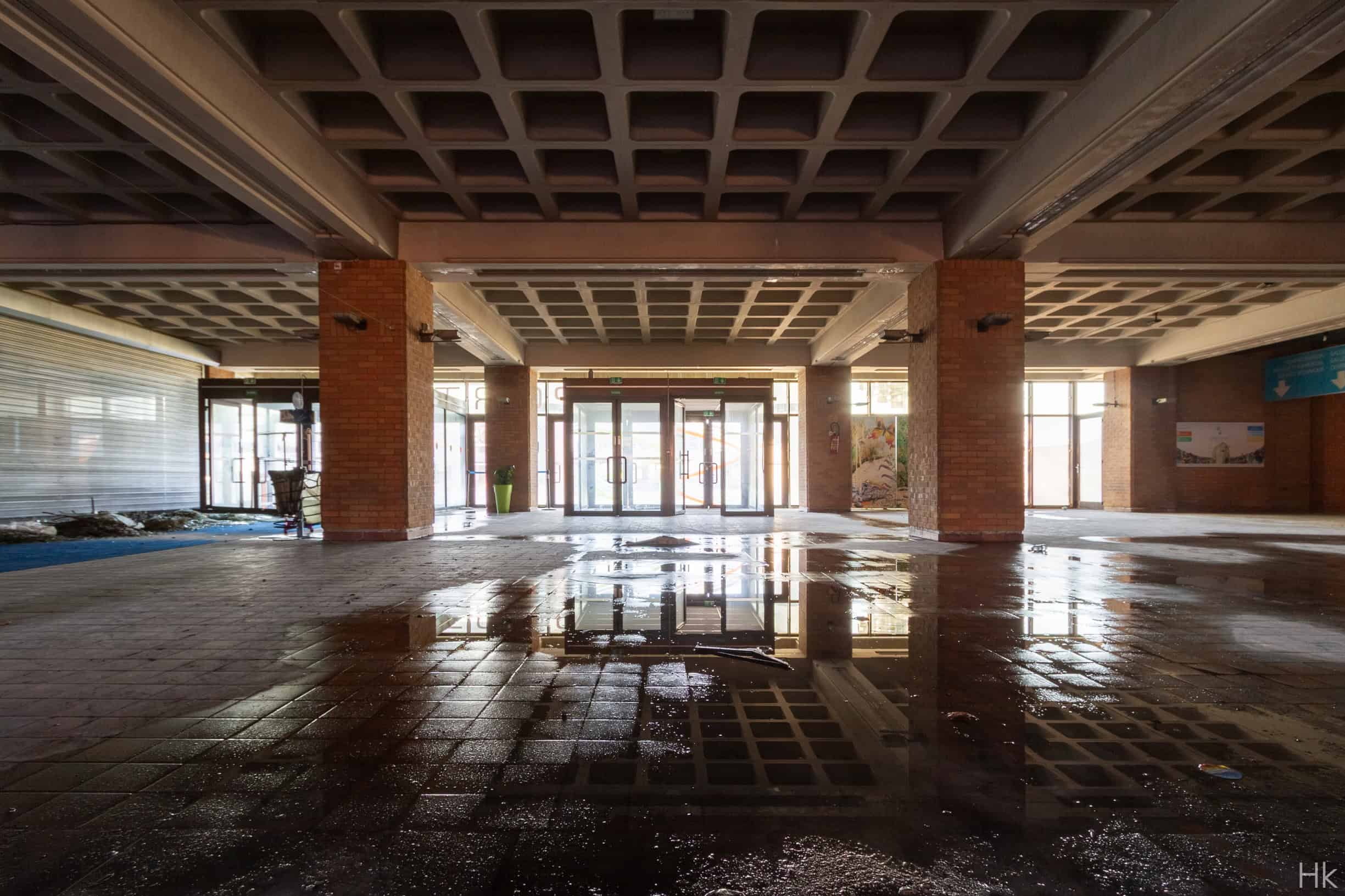 L’entrée de la piscine et les restes de la salle de basket